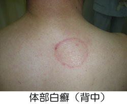 「しらくも」と呼ばれる、白く粉をふいたような状態になります。重症化するとケルスス禿瘡(とくそう)という赤く腫れ上がり、膿がたまった状態になることがあります。